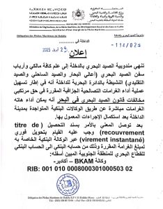 بعد توصل المعني بالأمر بسند التحصيل ( titre de recouvrement) وجب عليه القيام بتحويل فوري (virement instantane) عبر الوكالة البنكية الخاصة به لمبلغ الغرامة المقررة وذلك من حسابه البنكي الى الحساب البنكي للقطاع البحري للمنطقة الجنوبية المبين أسفله: