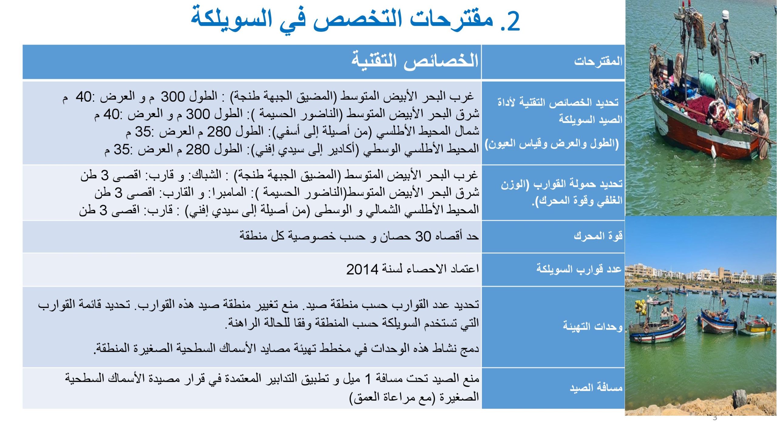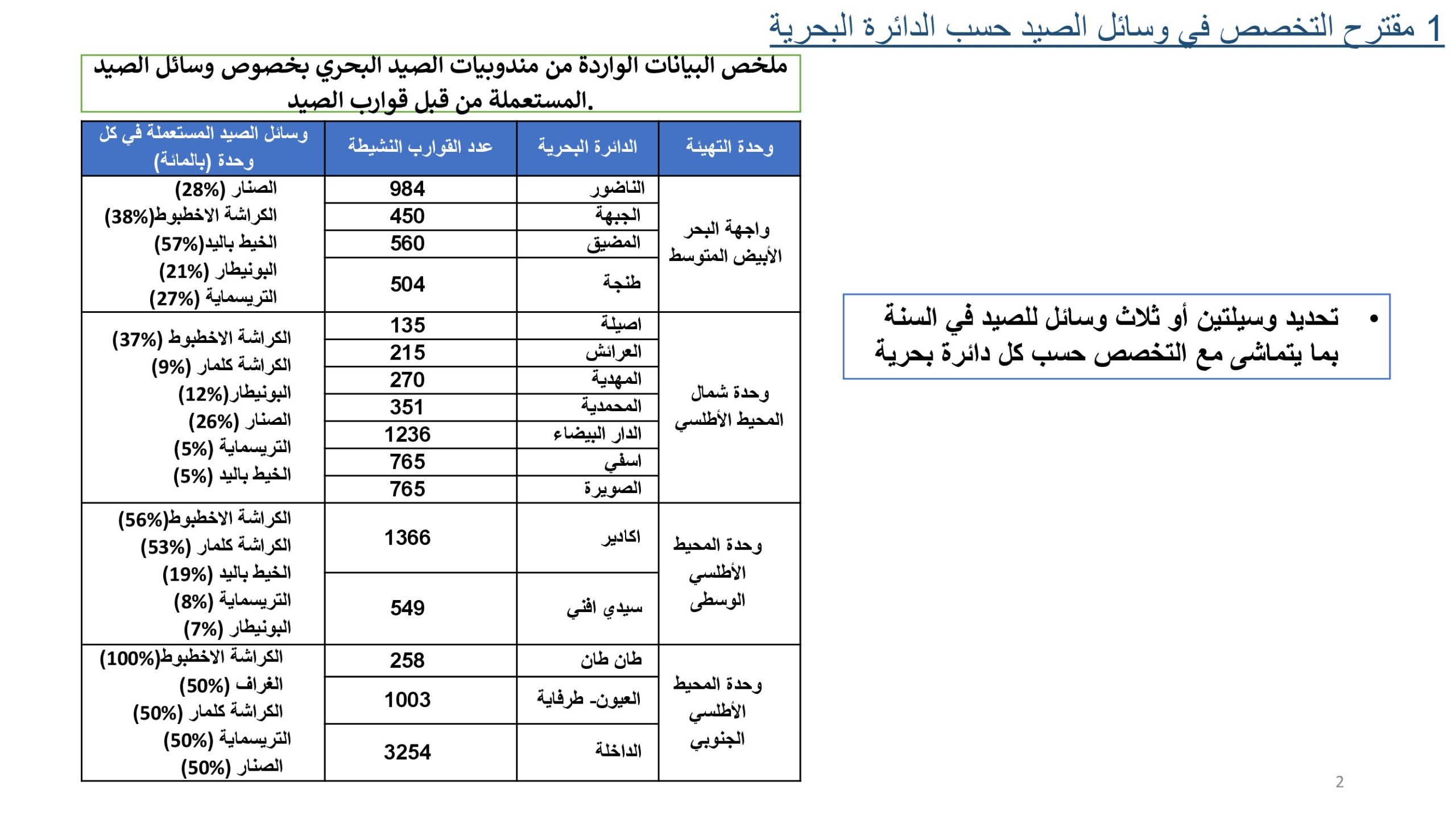 وتقترح الوثيقة الرسمية حصر وسائل الصيد لكل وحدة مهنية في وسيلتين أو ثلاث فقط في السنة، بما ينسجم مع طبيعة المصايد المحلية، وتوصي بمنع التنقل بين المناطق أو تغيير وسيلة الصيد المعتمدة، لضمان استقرار البنية المهنية والاقتصادية.