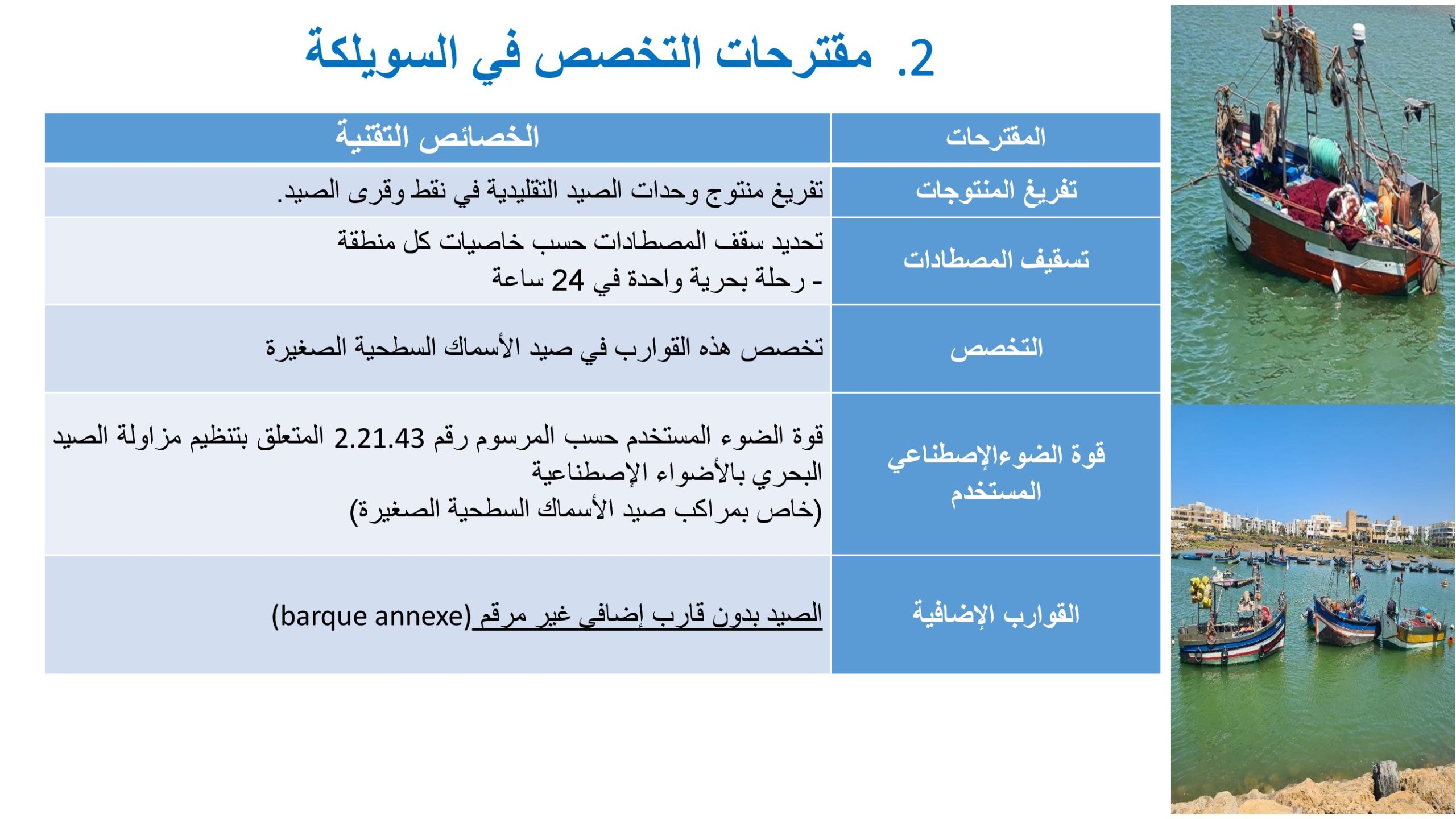 وفي هذا السياق، قدمت كتابة الدولة المكلفة بالصيد البحري عرضًا تقنيًا وتنظيميًا يهم الصيد التقليدي على مستوى التراب الوطني، حيث تضمن مجموعة من المقترحات التي ترتكز على تحديد تخصصات واضحة في وسائل الصيد، وتقنين الجهد البحري المبذول، مع التأكيد على احترام معايير السلامة الصحية والبحرية، وضبط خصائص قوارب “السويلكة” من حيث الأبعاد الهندسية والحمولة وقوة المحرك.